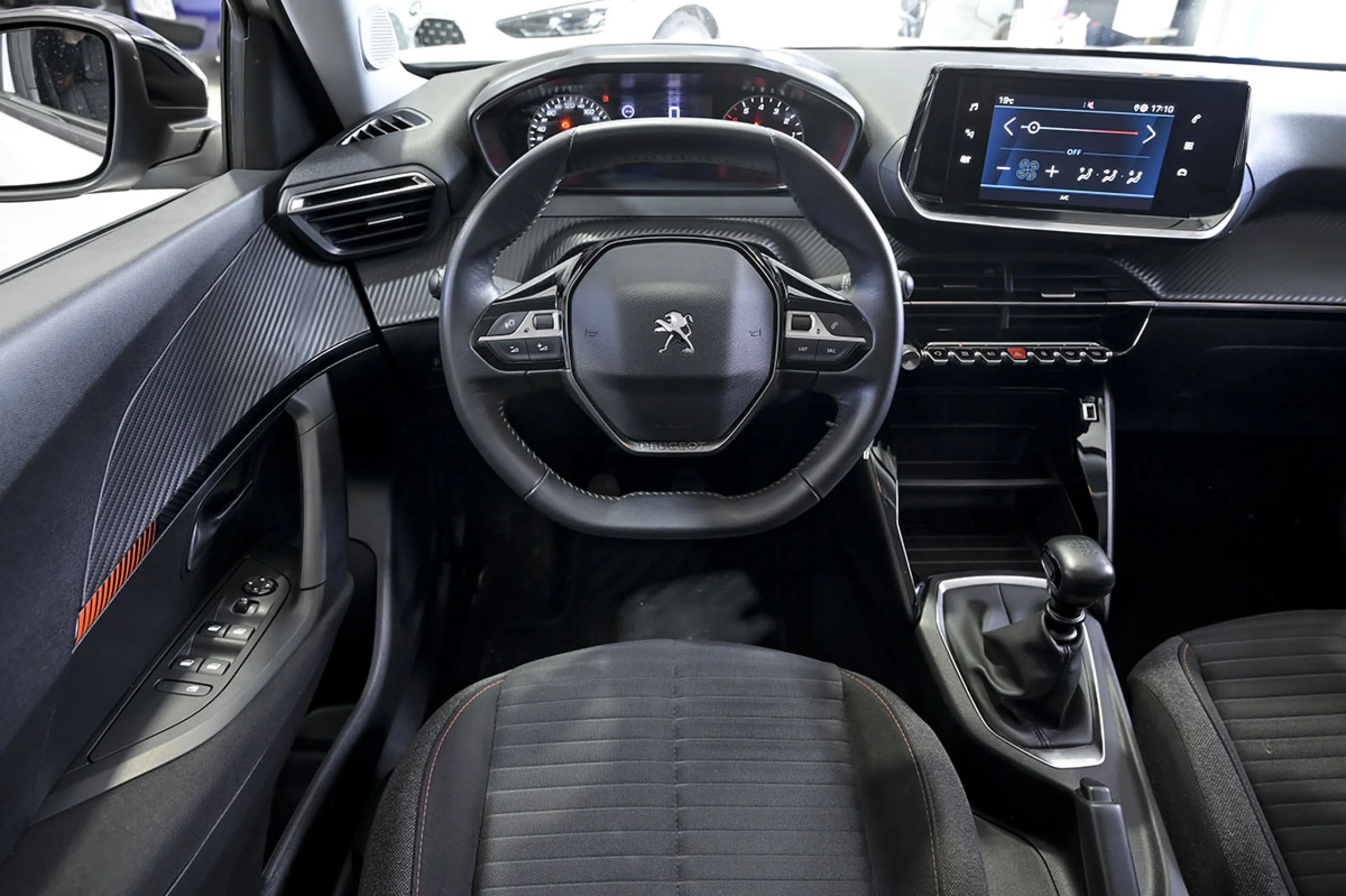 Acabados de lujo: pomo de la palanca de cambios en cuero, consola central en negro piano, puertas en símil fibra carbono, tablero en simil fibra de carbono y empuñadura del freno de mano en cuero